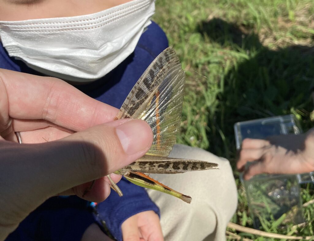 他のバッタに混じっていてもすぐわかる。段違いの飛距離とバサバサ音、後翅の模様でクルマバッタとの違いもわかる。 この日採集したのはオスだけ。発生ピークはもう少し後かも?