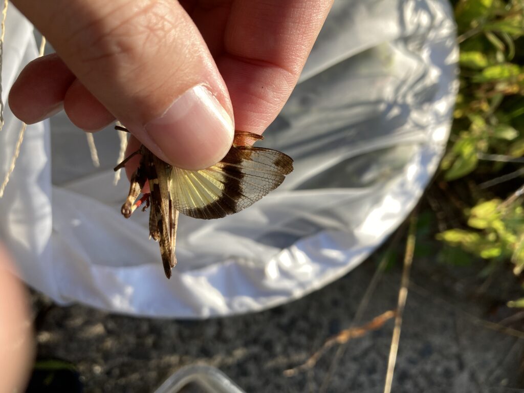 クルマバッタ緑色型と褐色型のオスを採集。大量にいたクルマバッタモドキと比較して数は少なく、羽音が大きく飛距離があって歯ごたえがある。 オスしか見つけることができなかったたので発生ピークはもう少し後か? 2022.09.25 新潟県田上町