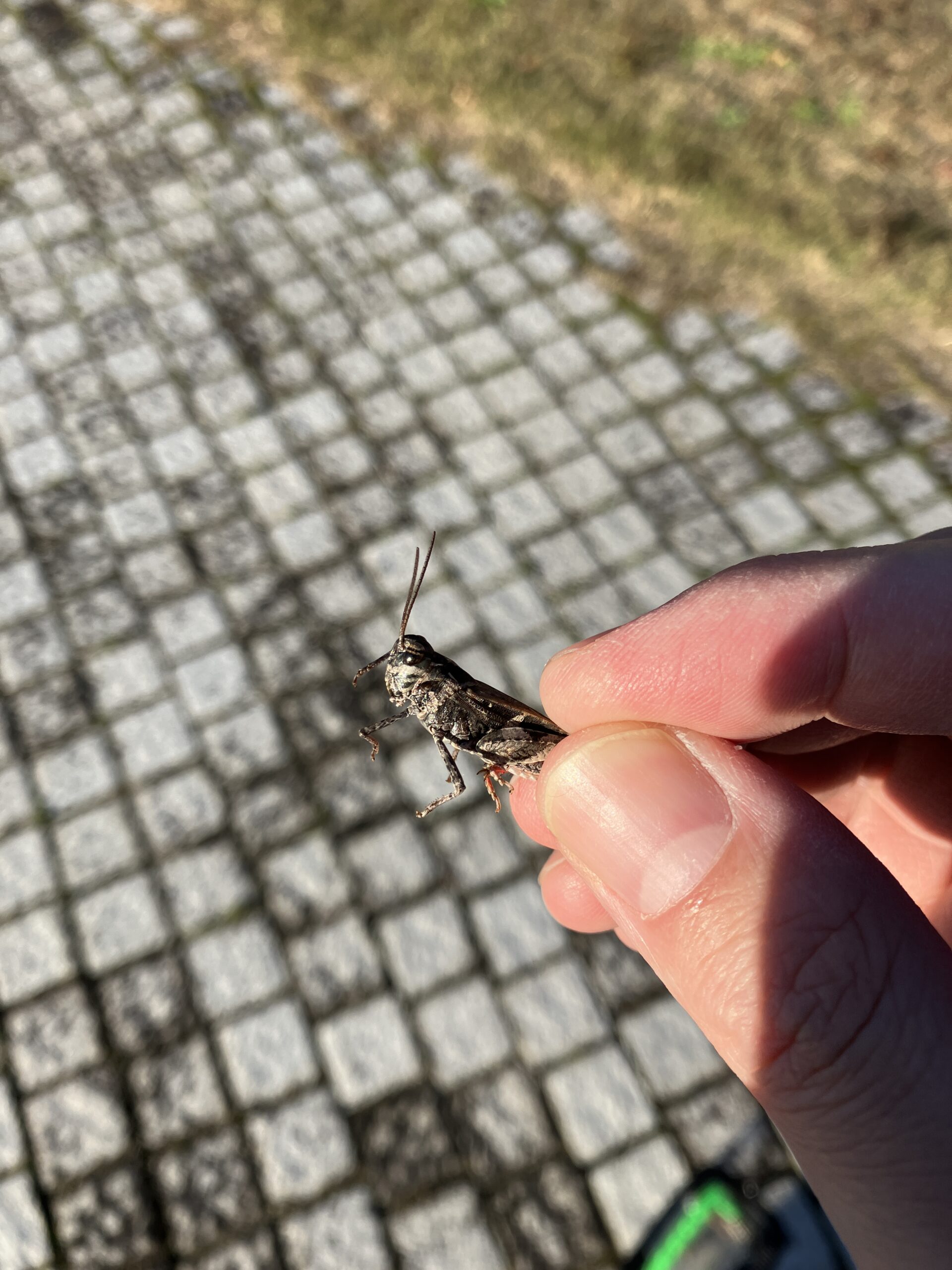 石段の上でひなたぼっこしてました。近づくと元気よく跳んで逃げました。