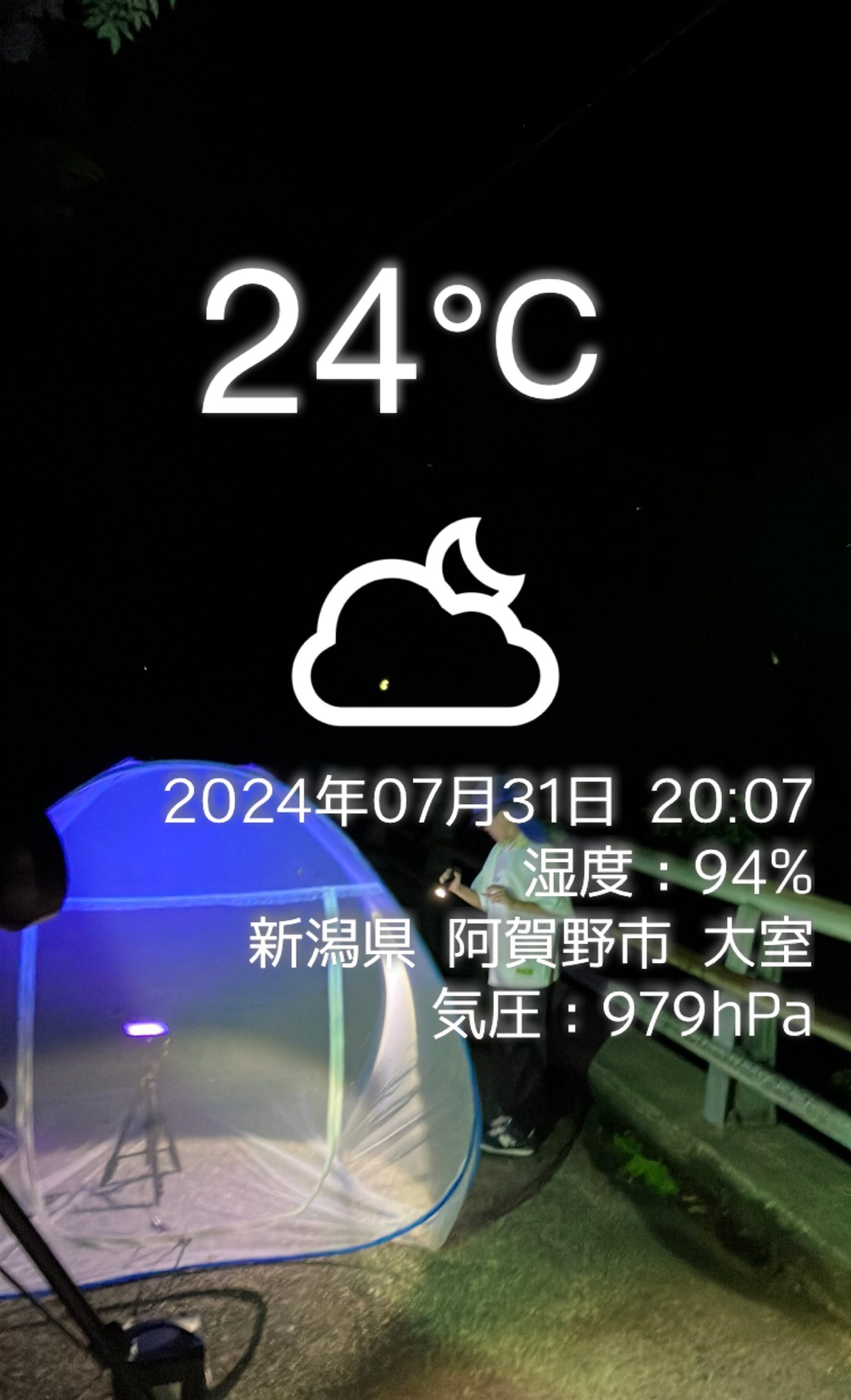 仕事と家庭の事情で現地到着は20時。5分で設営して即点灯。