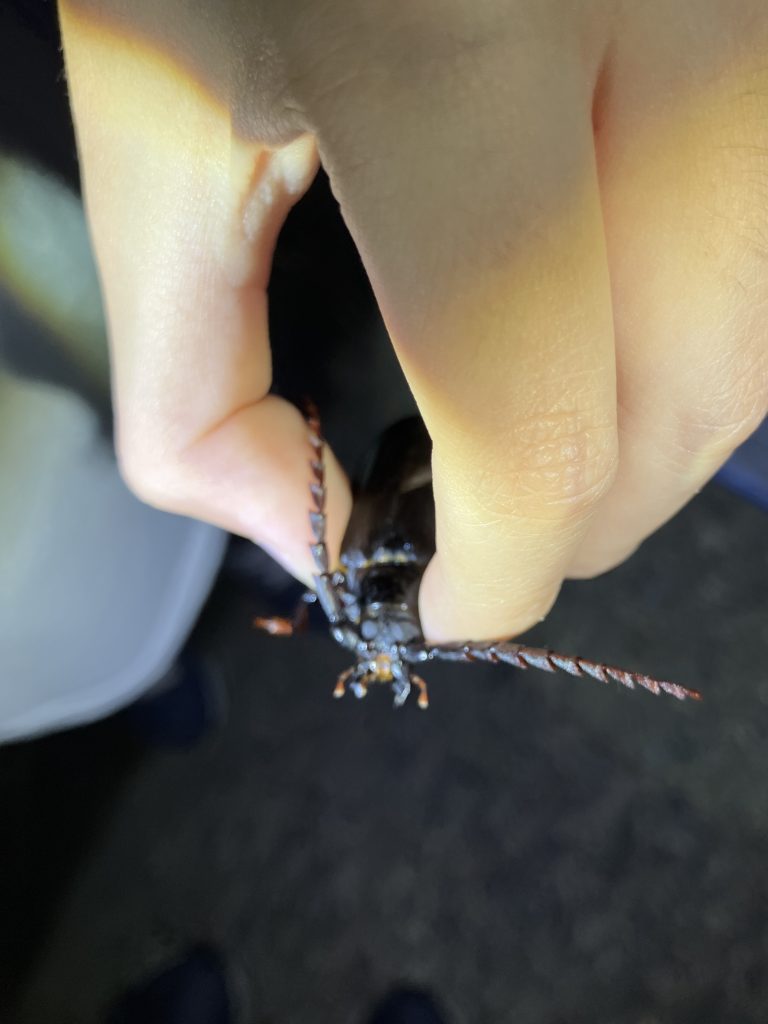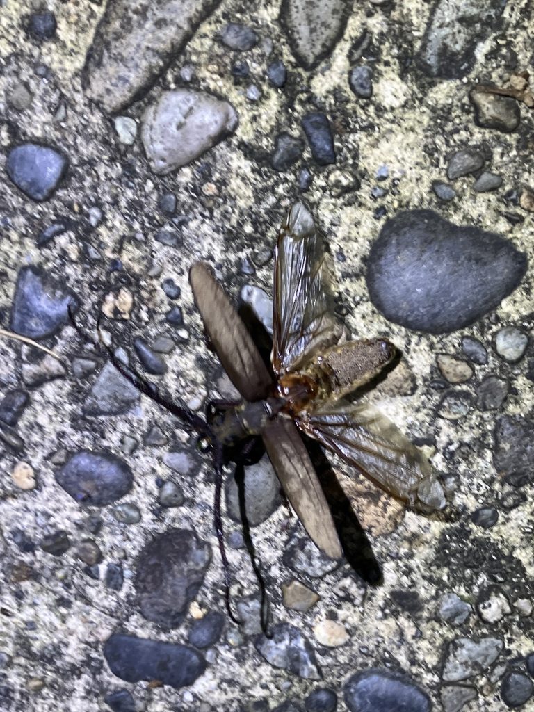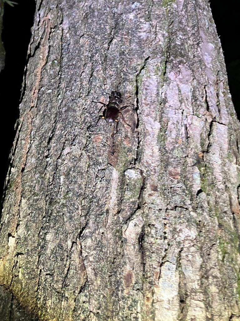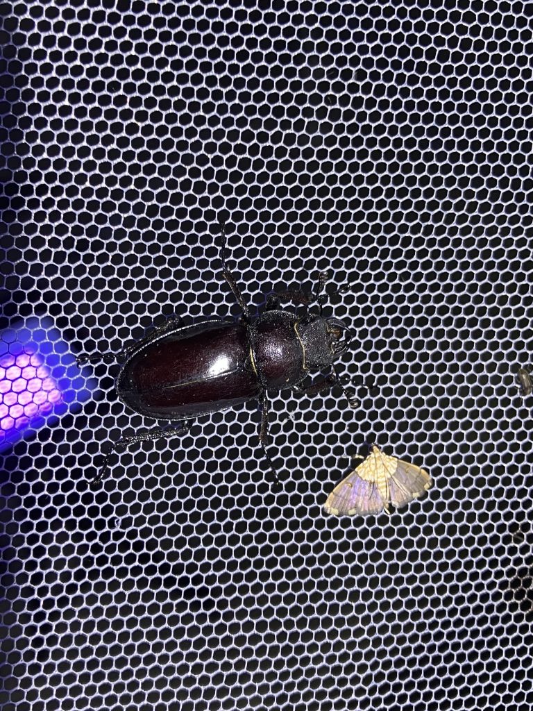 21時半くらいに飛んできた汚クワガタ(ノコギリ♀)、ダニをいっぱい乗っけたクロシデムシと見間違えて一瞬ゾっとしたやつ。