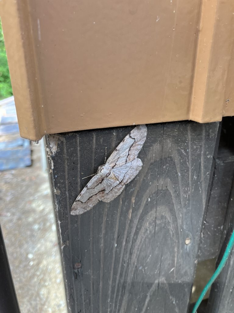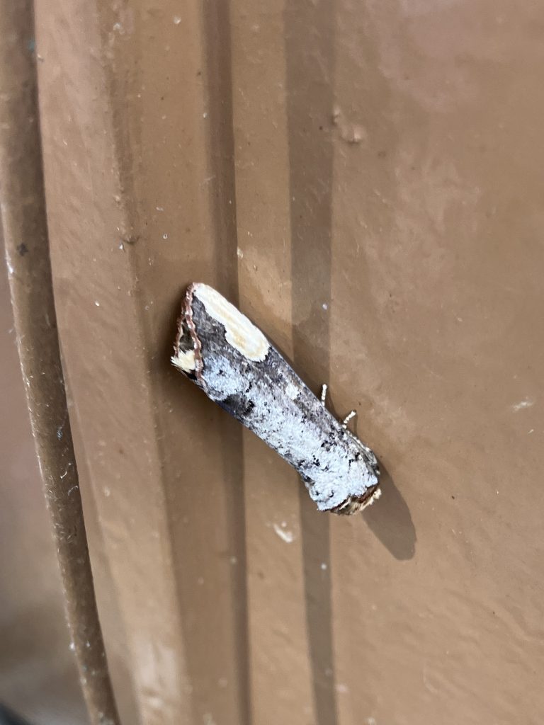 こちらも外灯の居残り組のリンゴツノエダシャク。これも似たのや何種かいて黒化個体はぱっと見わけわかめ。