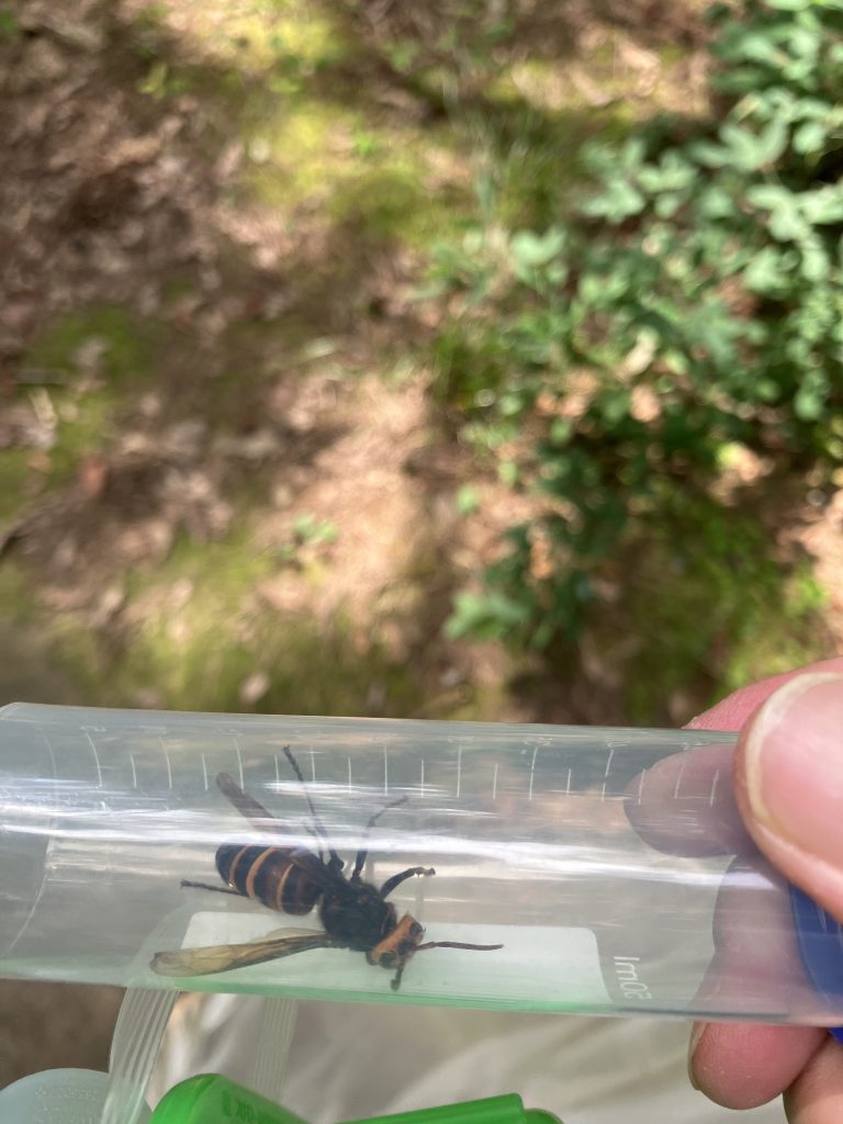 樹液に来ていたスズメバチ。お尻の先が黒いのでヒメスズメバチ?同じ場所でコガタスズメバチも飛んでるのを確認しました。