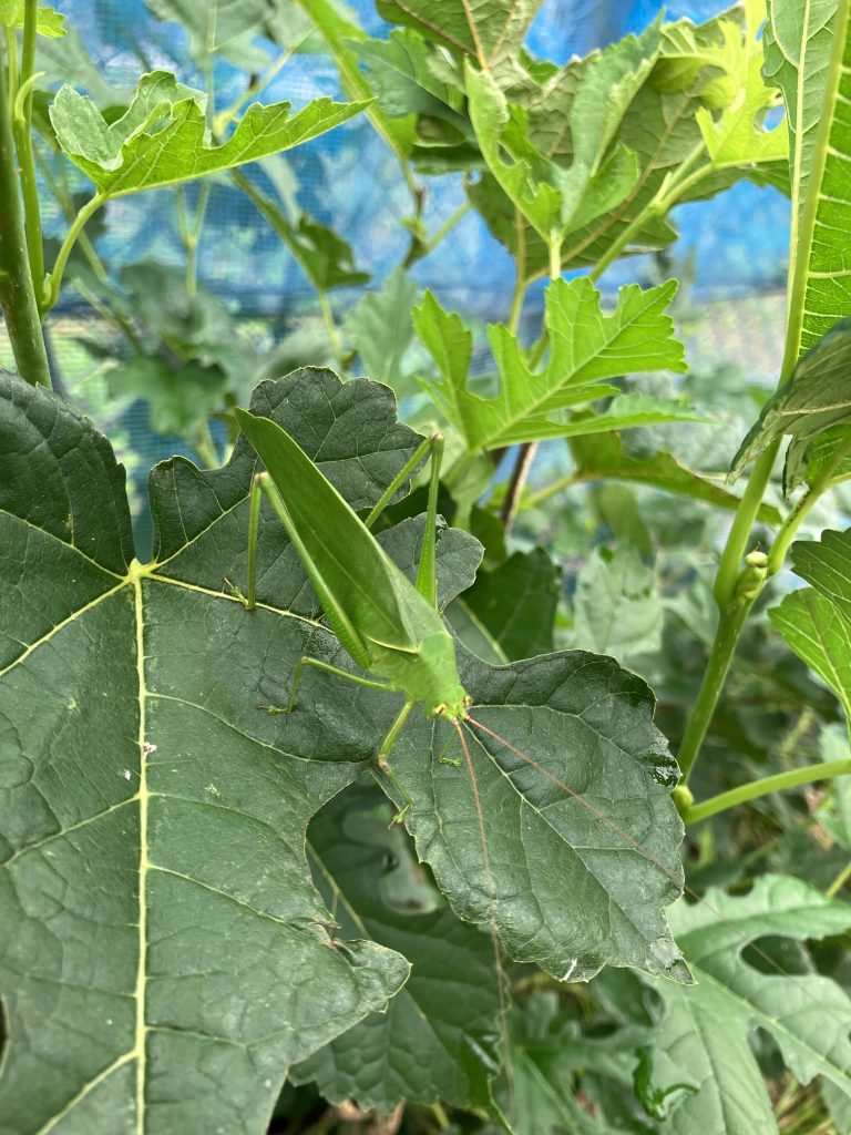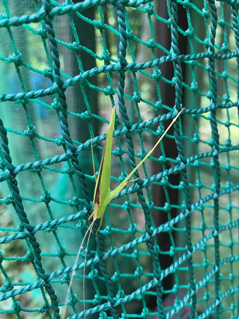 胎内昆虫の家周のネットにくっついていたセスジツユムシ。