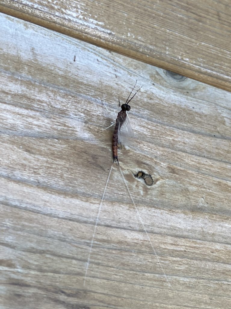 トイレのライトの居残り組。チラカゲロウのオス。複眼がデカいのが特徴らしいです。(息子談)