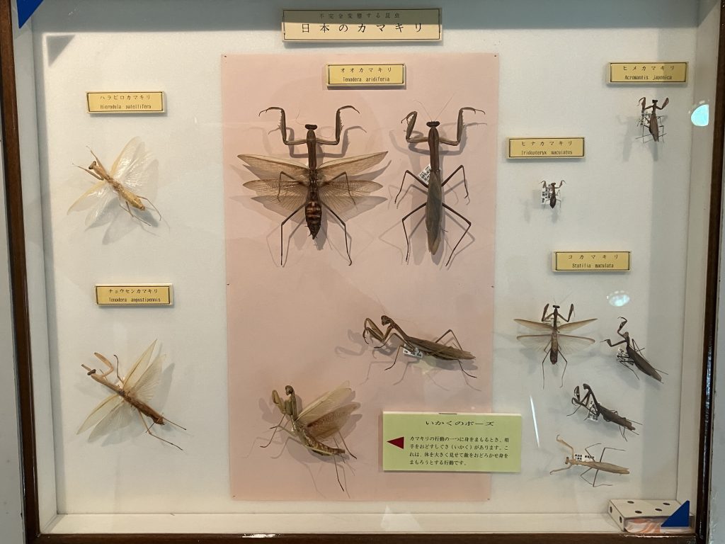 常設展示では今回はカマキリの立体標本が参考になりそうなので写真に収めてきました。威嚇ポーズの羽広げ標本を作る際に、シリカゲル密閉で急速乾燥すると羽がデロデロになってしまいそうなので要研究。