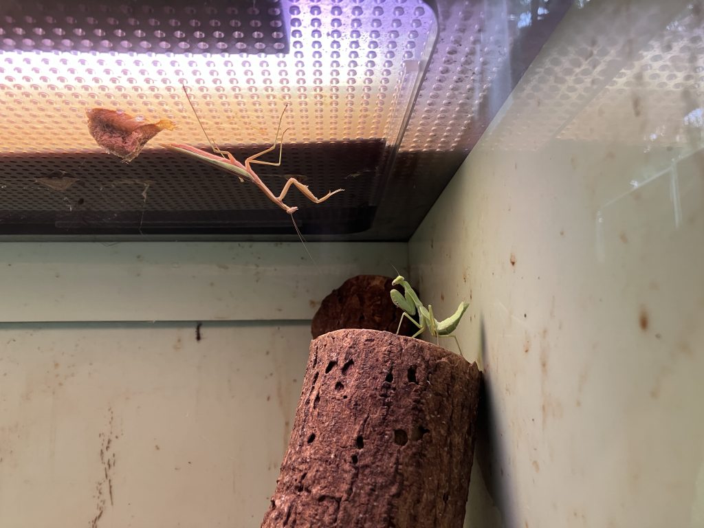 ゲージの中のオオカマキリvsハラビロカマキリ。いいアングル