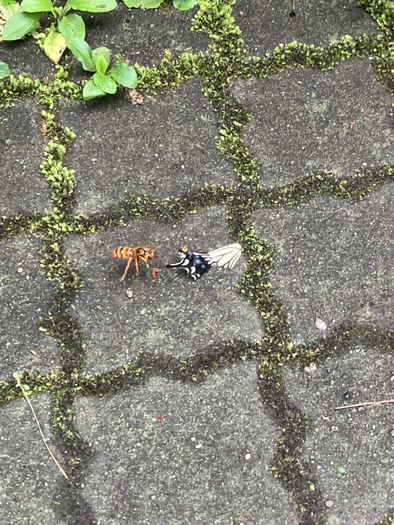 さらに、そのアゲハチョウの翅で肉団子を作ろとして上手くできないでいるキイロスズメバチの様子。