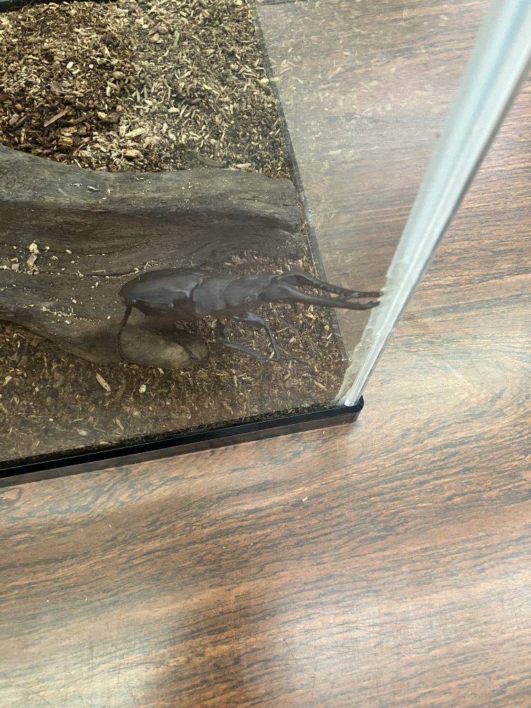 水槽のシリコンに当たり散らしてるギラファノコギリクワガタ。ギラファは日本語でキリンという意味ってのは結構有名ですが、これがキリンに見えたことは一度もありません。展示名のキバナガノコギリクワガタのほうがしっくりくる・・・。