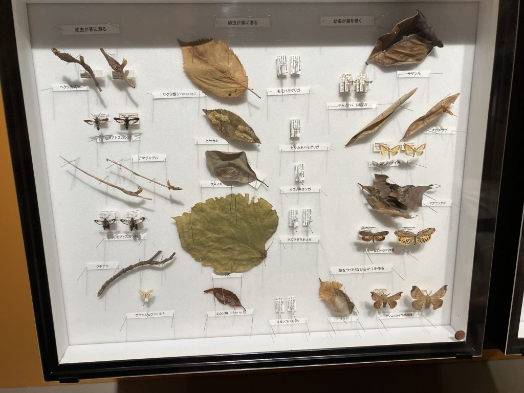 蛾の成虫とマユが一緒に展示されているのがとても斬新。