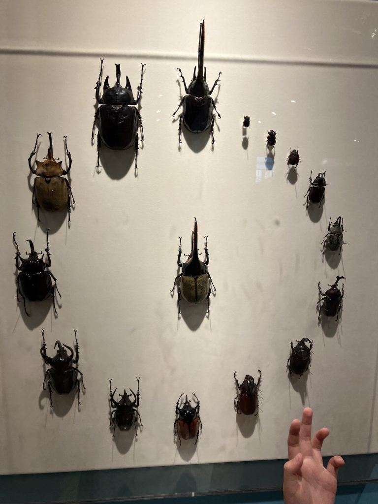 カブトムシの最小~最大サイズを並べた標本展示。(ここが一番混んでた)
