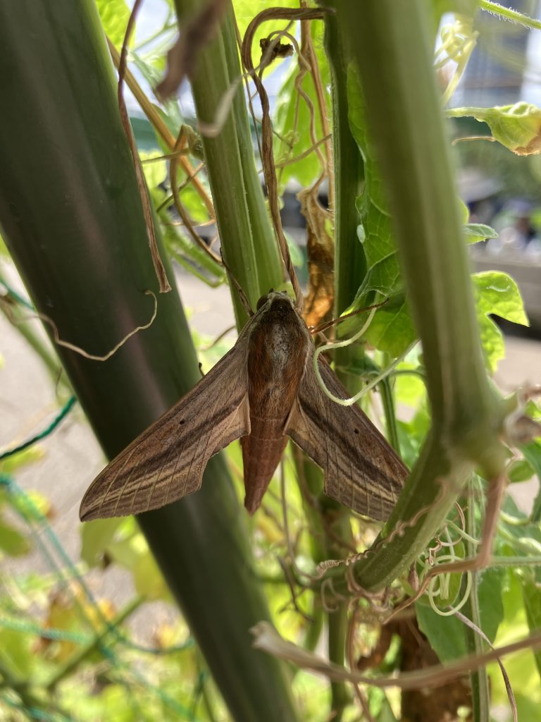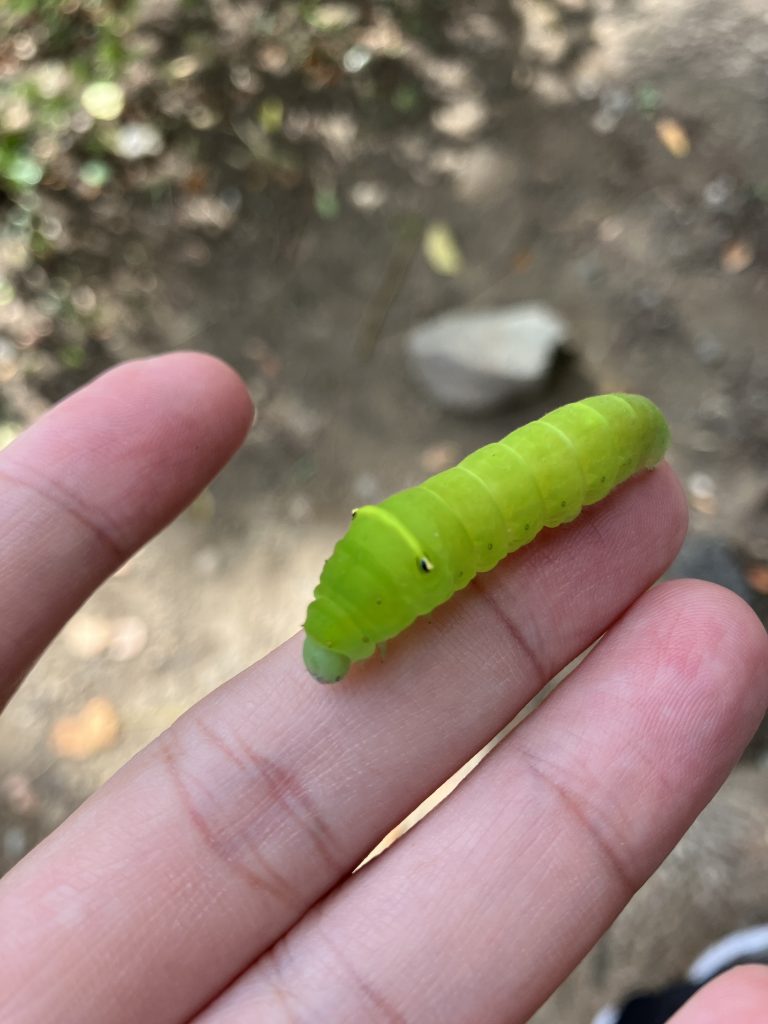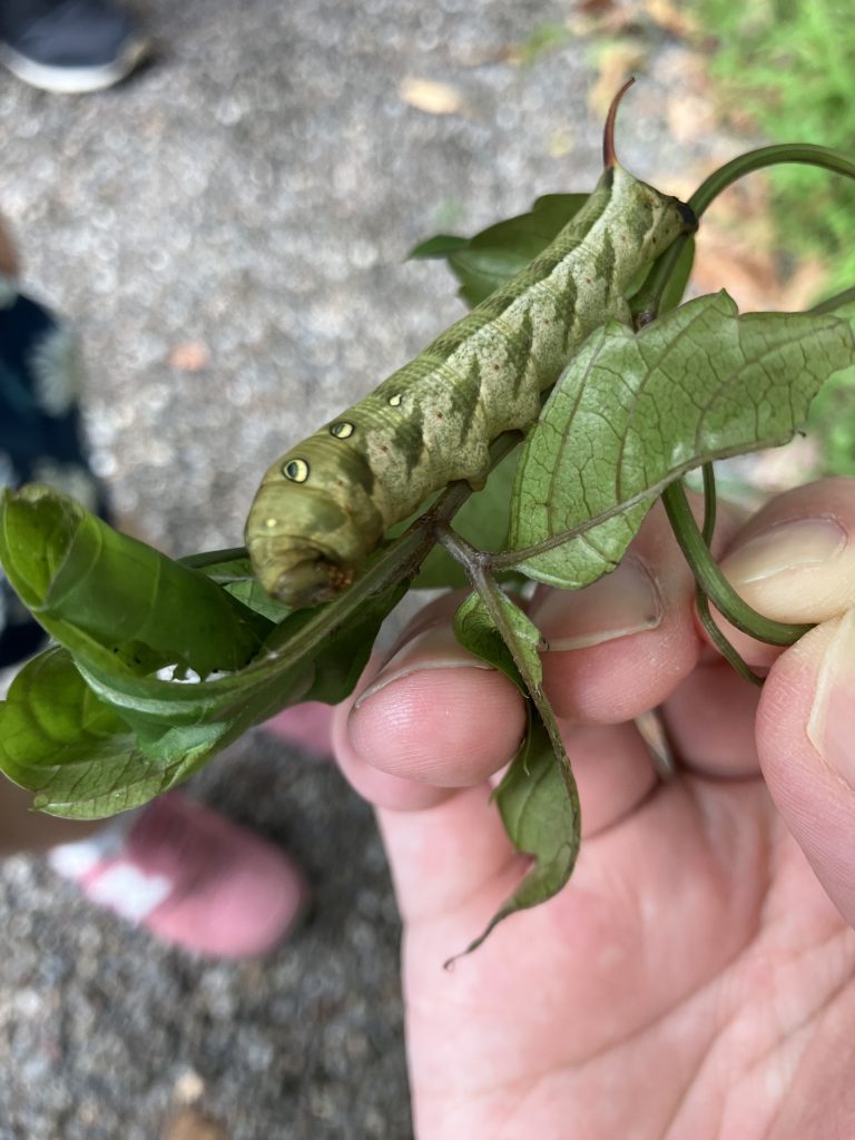 ホッキョクグマの展示の横でみつけたスズメガの幼虫。エビガラスズメ?