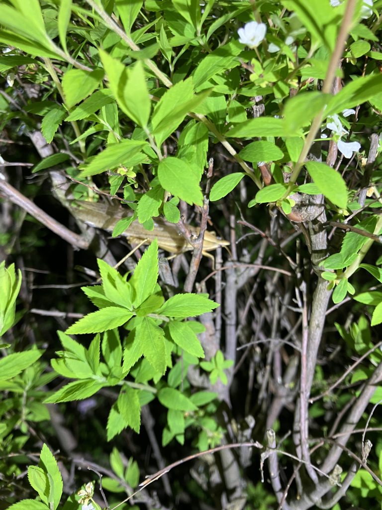 音を頼りにユキヤナギの茂みで鳴くクビキリギスを発見