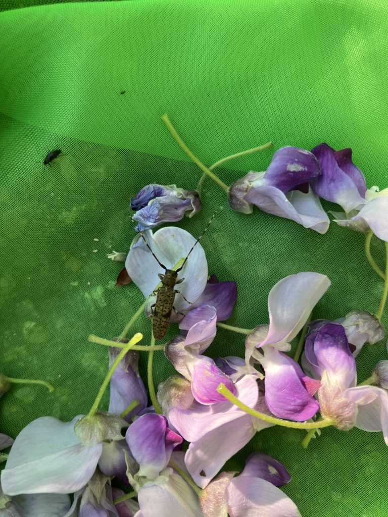 フジの花をガサガサするとカミキリムシ、ハナムグリ、ハムシ、コメツキムシといった小型甲虫がざくざく採れます。