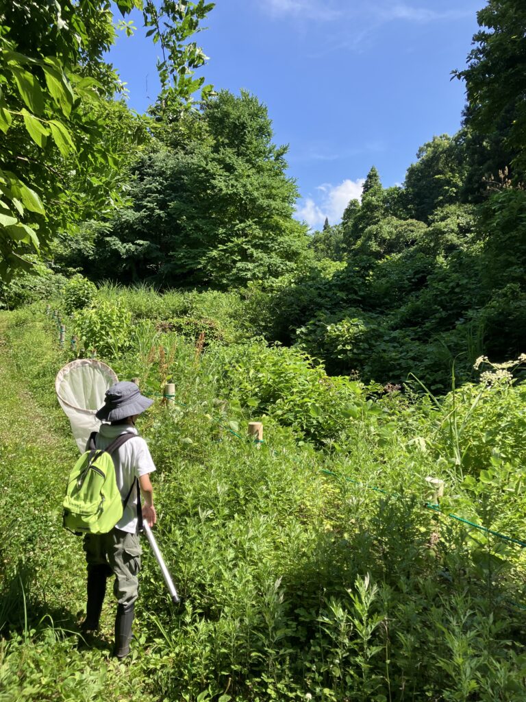お昼に見た長岡科学博物館の標本展示の影響で、東山丘陵地方面で採集しようということになり、午後は東山ファミリーランド付近の林道で採集を行いました。