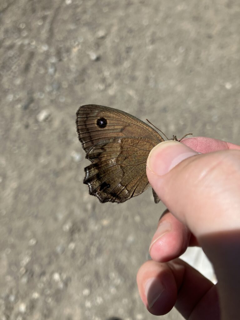 ジャノメチョウのオス。あとで調べてわかったのですがこれは日当たりを好む種類のようです。