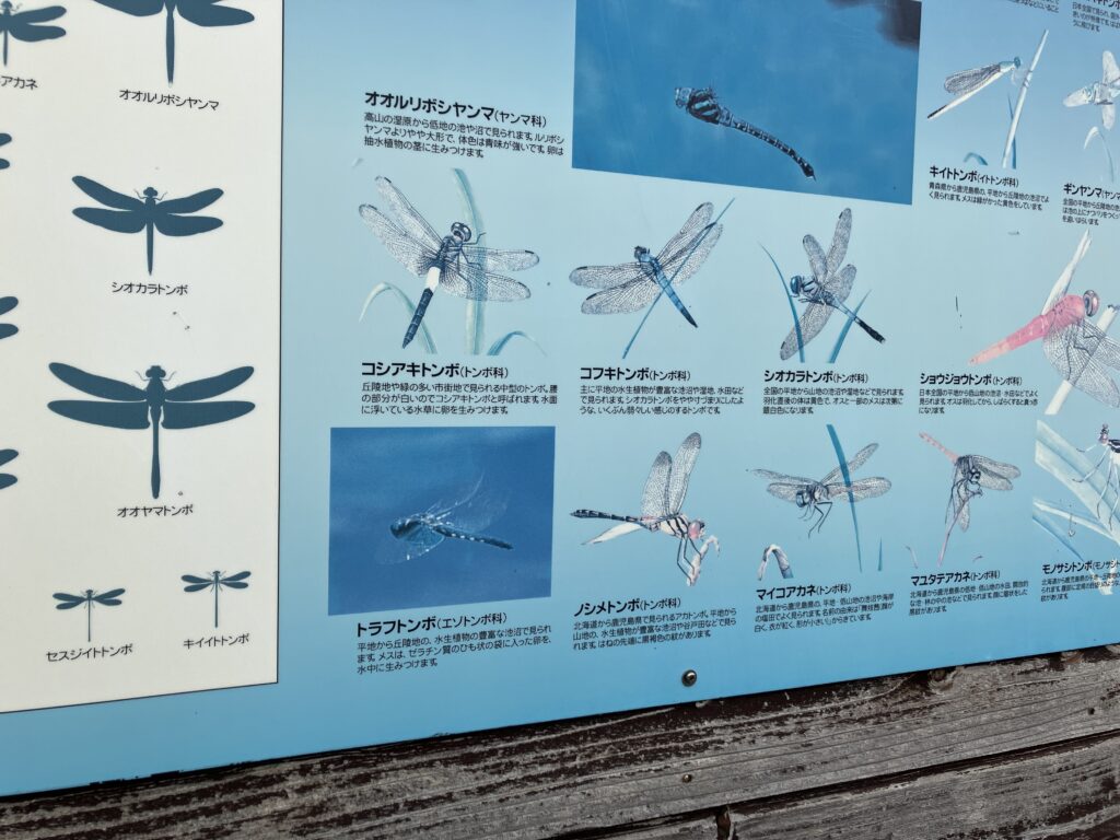 トイレ脇の看板に清潟にいるトンボの種類や大きさが紹介されてます。