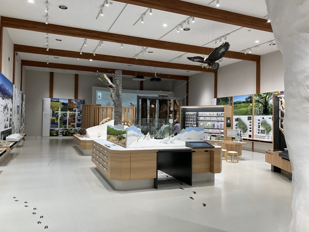 中は妙高山の動植物や昆虫に関する展示コーナーがあり、昆虫採集に疲れたら涼みながら展示を楽しめます。お洒落なカフェもあり観光客でにぎわってました。あとトイレがとても綺麗でした。