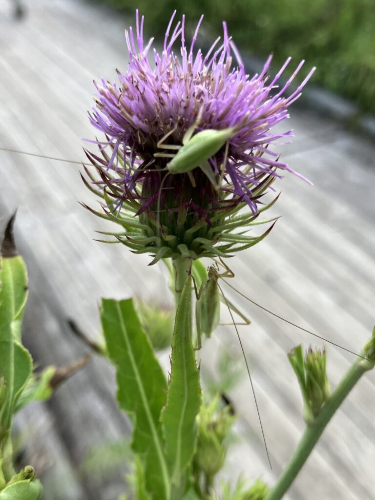 まだアザミの花が咲いていて、そこにカンタンがついてました。